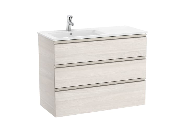 Unik GAP. Conjunto de mueble base tres cajones modelo GAP y lavabo desplazado a la izquierda. Acabado fresno nórdico medida 1000x460. Cajones con cierre amortiguado. No incluye grifería