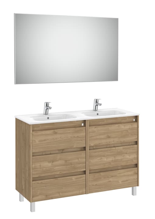 PACK - Conjunto de mueble de seis cajones con lavabo doble y espejo Victoria con aplique LED Starlight. Incluye patas. No incluye grifería.