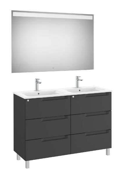 Pack ALEYDA. Conjunto de mueble base seis cajones con patas incluidas modelo ALEYDA con lavabo doble y espejo EIDOS . Acabado negro mate medida 1200x460. Cajones con cierre amortiguado. No incluye grifería