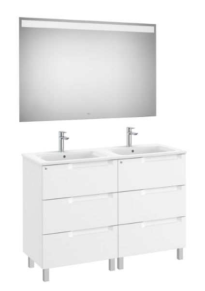 Pack ALEYDA. Conjunto de mueble base seis cajones con patas incluidas modelo ALEYDA con lavabo doble y espejo EIDOS . Acabado blanco mate medida 1200x460. Cajones con cierre amortiguado. No incluye grifería