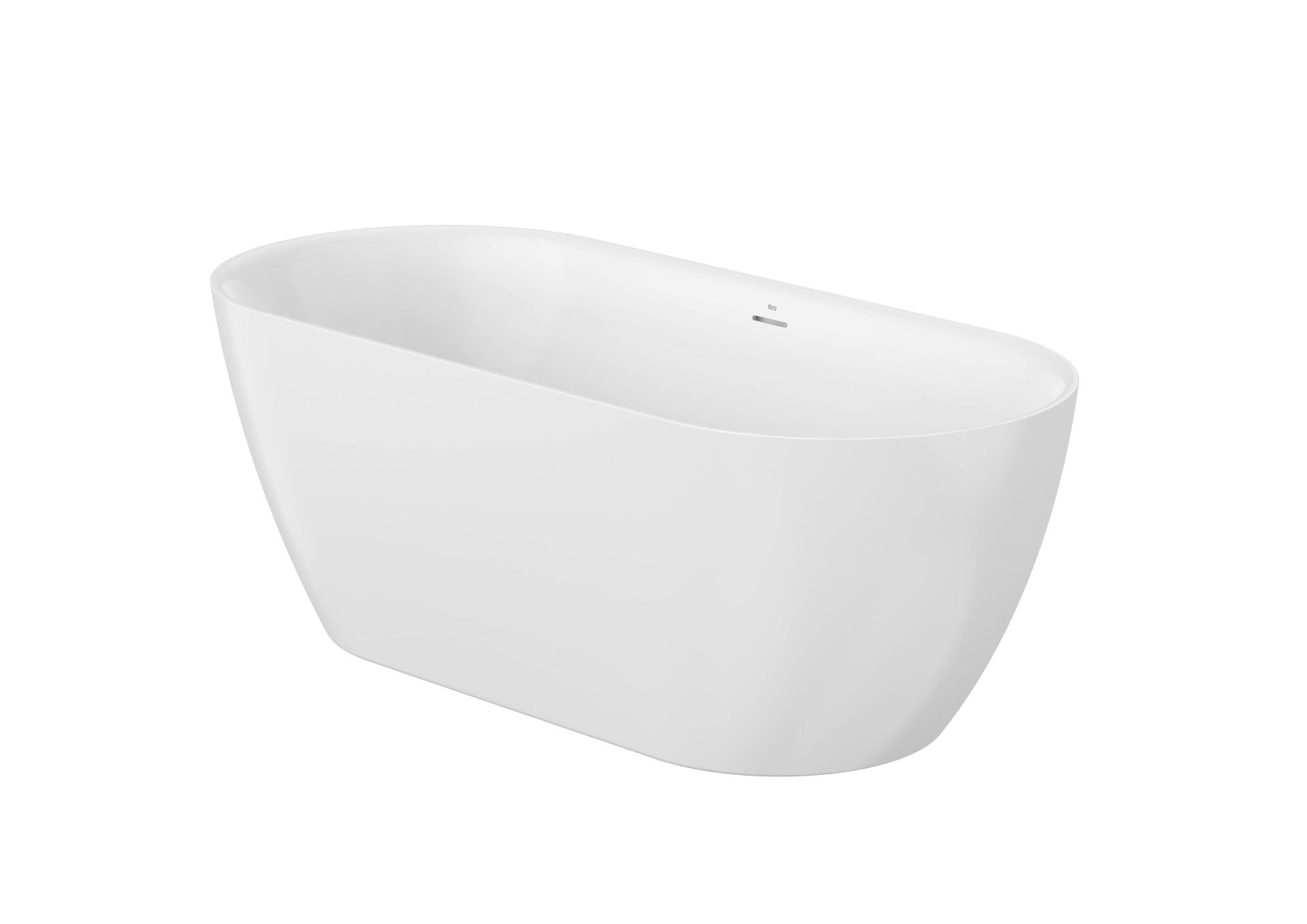 Bañera acrílica one-piece exenta, con faldón integrado y juego de desagüe click-clack y sifón.