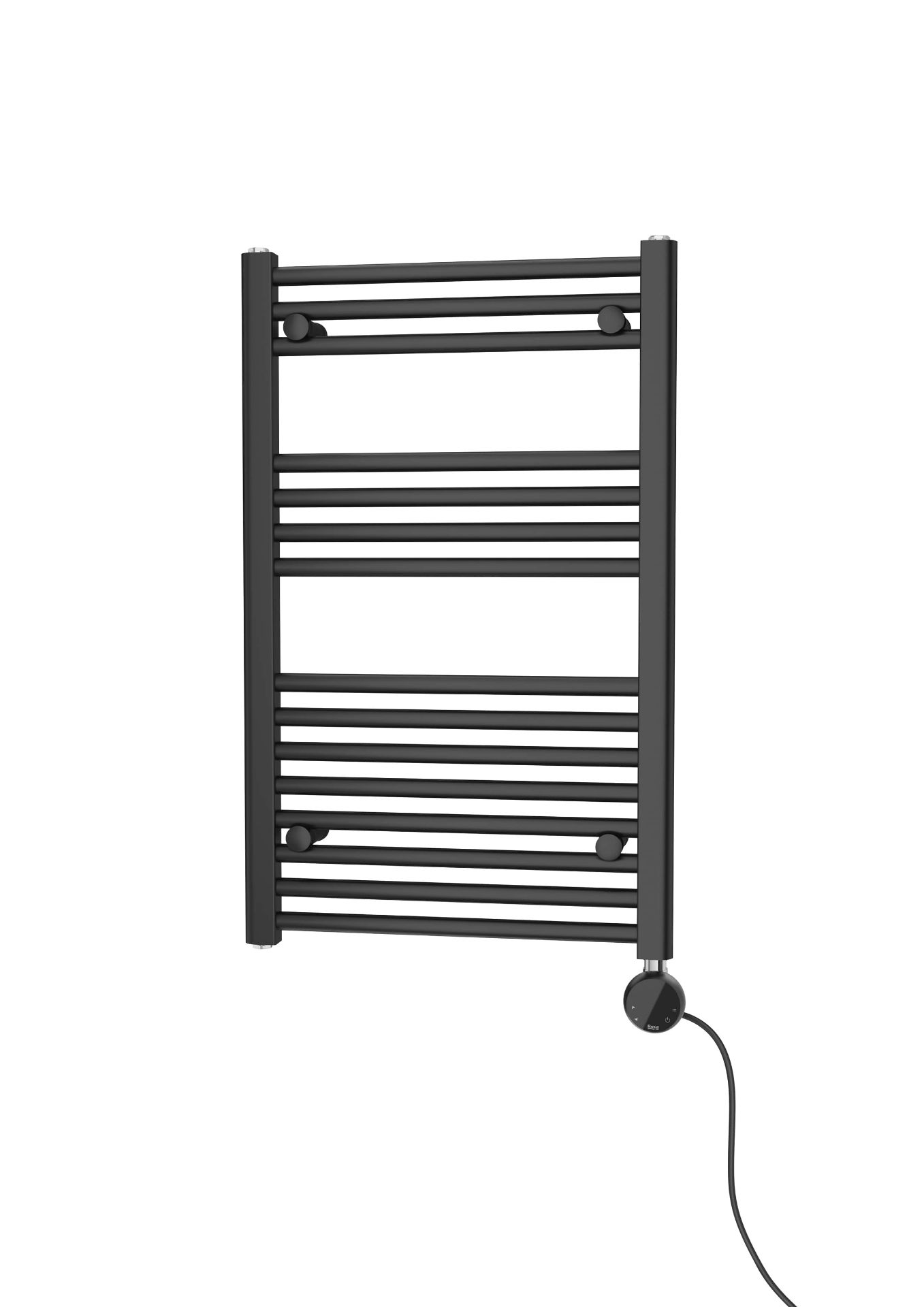 Radiador toallero eléctrico VICTORIA-N. Acabado negro mate, medida 1200x500. Con termostato 3 funciones: 4 niveles de temperatura, temporizador de potencia con auto-off. Potencia 300W. Bajo consumo durante modo reposo.Con kit montaje.Potencia 300W