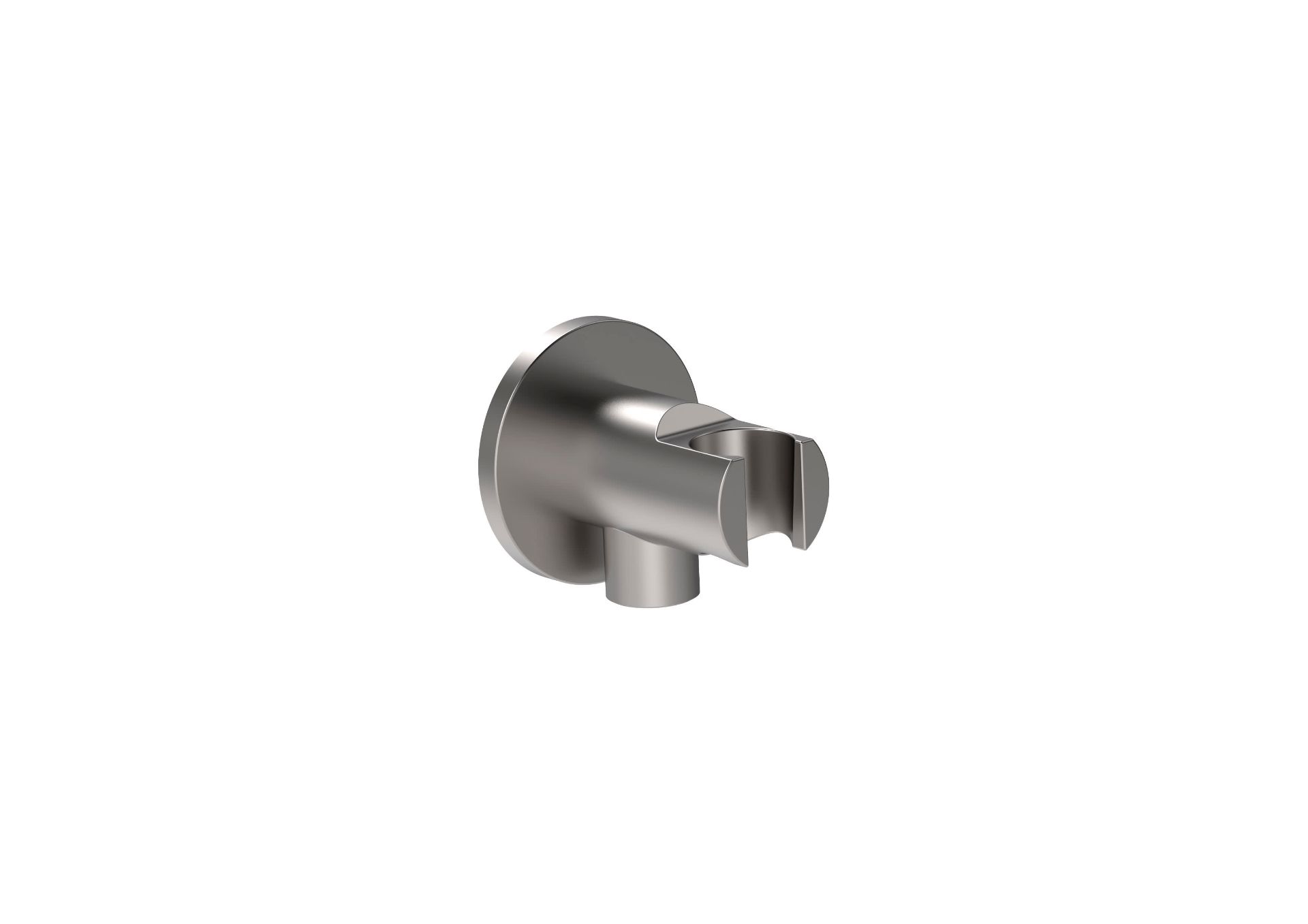 Toma de agua 1/2 redonda con soporte para conexión flexo de ducha. Acabado acero inoxidable.